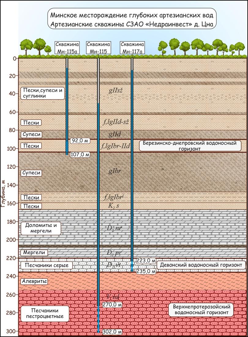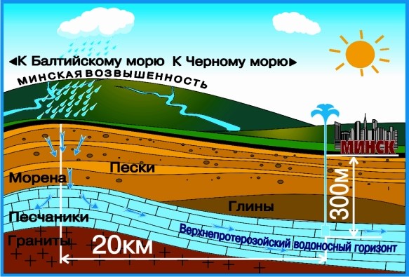 Минское месторождение глубоких артезианских вод в районе д. Цна Минского района, где мы осуществляем забор воды из своих артезианских скважин, по материалам геологоразведочных и гидрогеологических исследований представлено из нескольких водоносных горизонтов. Самый глубокий из них верхне-протерозойский водоносный горизонт пресных вод. Он сосредоточен на глубине 235 – 302 м в толще вендских пестроцветных песчаников валдайских отложений верхнего протерозоя, геологический возраст которых составляет порядка 600 миллионов лет. Особое гидрогеологическое залегание этого древнего водоносного горизонта под мощным слоем вышележащих водоупорных горных пород, таких как супеси, суглинки, мергели, алевриты обеспечивает надежную экологическую защиту от современных техногенных загрязнений. На глубине 225 – 235 м присутствует второй по глубине водоносный горизонт, приуроченный к серым песчаникам средних девонских отложений, геологический возраст которых составляет порядка 350 миллионов лет. Он отделен от верхнепротерозойского водоносного горизонта плотным водоупорным слоем алевритов мощностью 20 м. Выше расположены несколько водоносных песчаных горизонтов более молодых четвертичных отложений с геологическим возрастом до 50 миллионов лет, на глубине 60 – 110 м, перемежающиеся супесями и суглинками. Вода в подземных горизонтах очень медленно двигается в сторону Черного моря. Она фильтруется естественным образом в земной толще горных пород до стерильного состояния и приобретает сбалансированный природой минеральный состав, характерный для белорусских недр в этом месте. Период фильтрации подземных вод в земной толще может составлять многие тысячелетия. Для защищенных песчаных водоносных горизонтов четвертичных отложений он составляет порядка 8000 лет. Для более глубокого верхнепротерозойского горизонта песчаников путь воды, которая двигается в недрах по водоносному горизонту на расстояние 20 км от зоны питания на Минской возвышенности до скважины Мн-115 из которой производится добыча, занимает по времени более 30 000 лет. Это говорит о том, что вода верхнепротерозойского горизонта имеет древнее ледниковое происхождение.